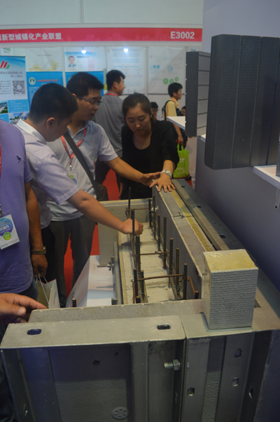 參展人參觀奧克森"OKS溫鋼模板保溫與結(jié)構(gòu)一體化"施工模型