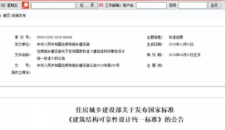 住房和城鄉(xiāng)建設部關于發(fā)布國家標準《建筑結構可靠性設計統(tǒng)一標準》的公告。