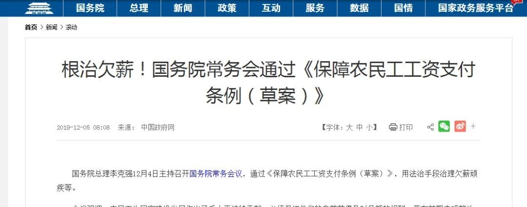 12月4日,國務院常務會議通過《保障農民工工資支付條例(草案)》,強調各級政府和國有企事業(yè)單位不得以任何理由拖欠農民工工資。要在前期專項整治基礎上,用法治手段推動根治拖欠農民工工資問題。