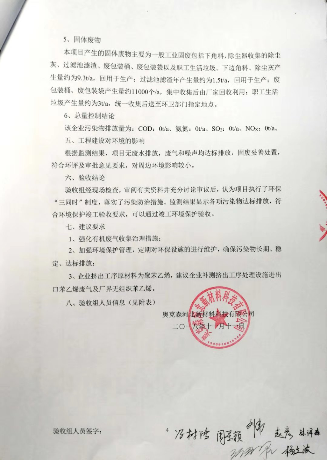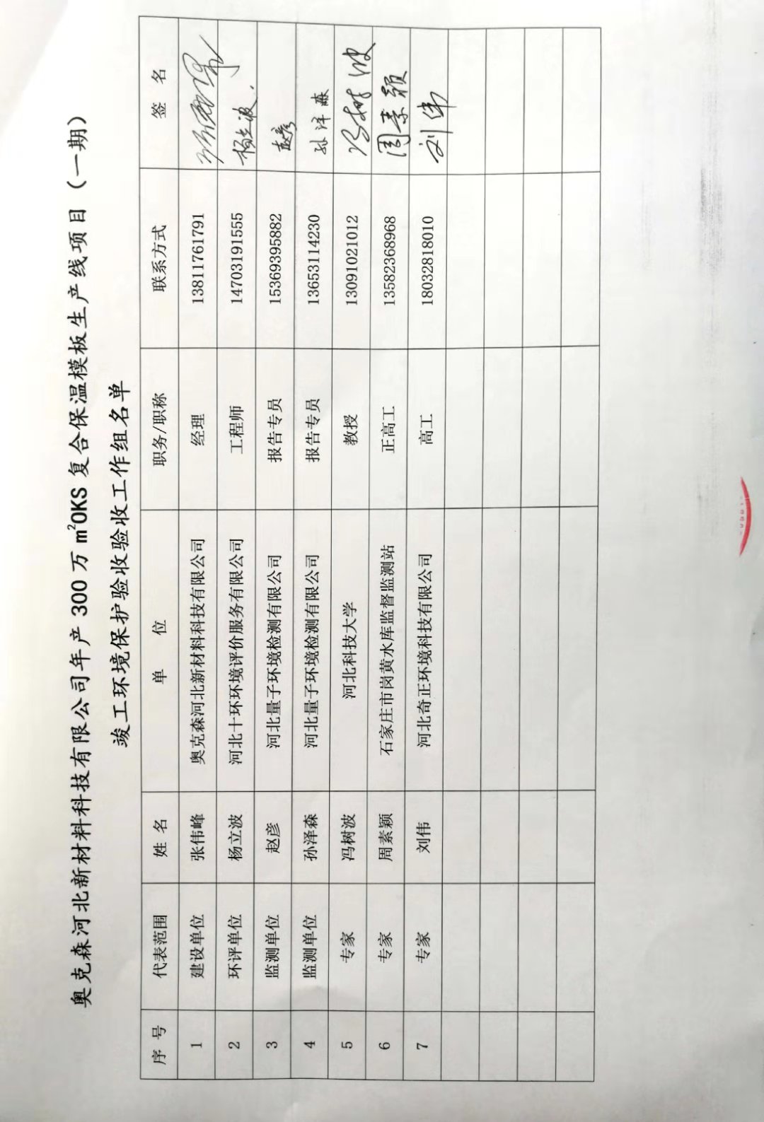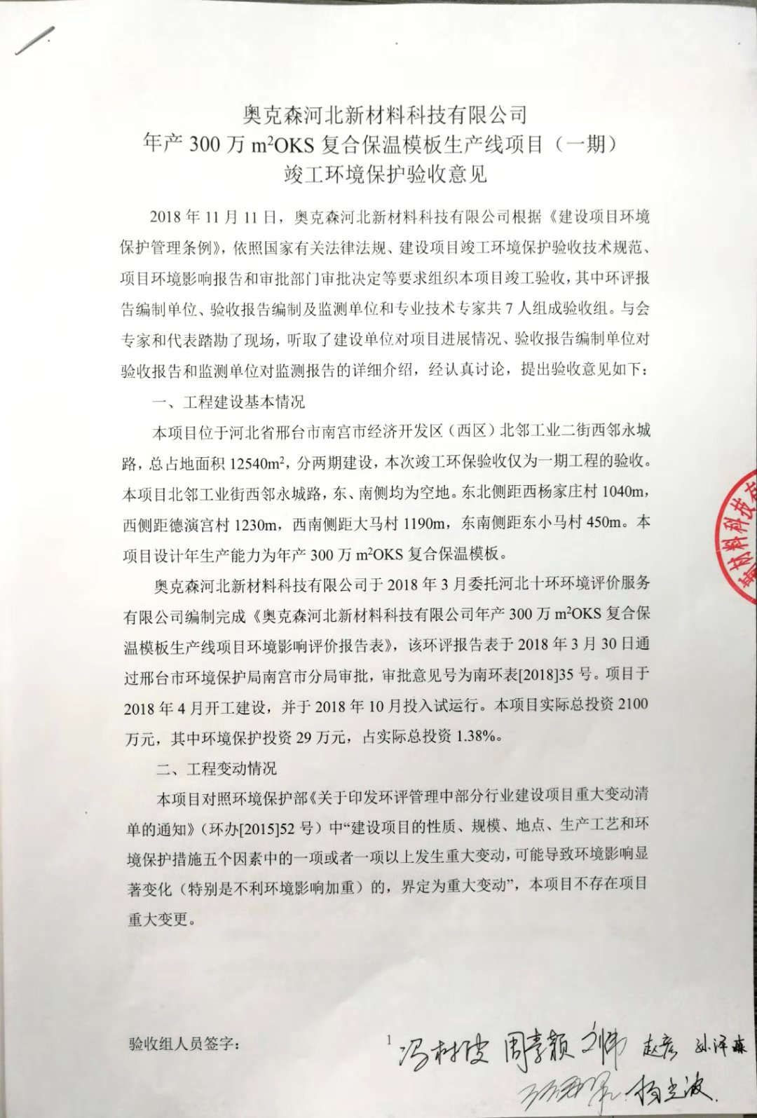 奧克森河北新材料科技有限公司 年產(chǎn)300萬(wàn)㎡OKS復(fù)合保溫模板生產(chǎn)線項(xiàng)目(一期) 竣工環(huán)境保護(hù)驗(yàn)收意見